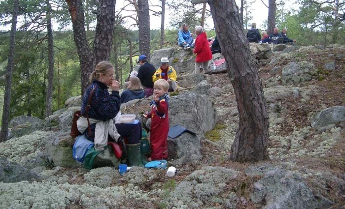 Sen vandrade vi uppför berget till högsta punkten, där man vid gynnsamma förhållanden kan se ända till Haga. Vi intog vår massäck precis på gränsen mellan Orkesta och Frösunda.