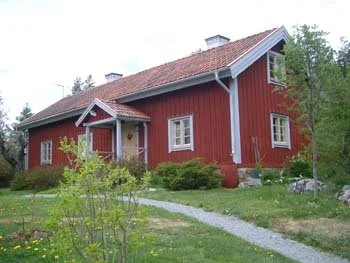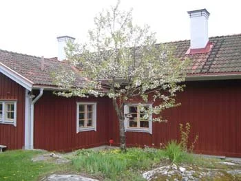 Blommande fruktträd på baksidan. Soldattorpet är tillbyggt både hitåt och åt höger.
