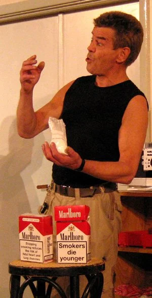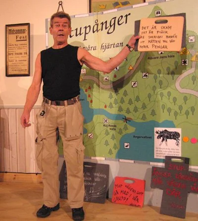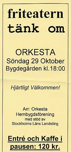 Ännu en gang stär man här fylld av förväning över vetskapen att människor kommer att köpa biljetter och slä sig ner och offra en kväll pà att se denna skröna vars existens vi inte hade en aning om för bara elt par manader sen. Som fem fägelholkar satt vi runt ett bord och förde osammanhängande samtal om samtiden, framtiden och hur det var pà 1900 -talet. Och sâ drack vi kaffe. Samtiden var helt obegriplig och överdriven med sina miljardbonusar, narkotikabrottsanklagade kriminalkommisarier, Kristi-brudar och pastorer, mutade systembolagare oh Euro-val. Framtiden tycktes bara kunna förutses to minuter i taget och krävde flexibilitet och omorganisation. Om den överhuvudtaget fanns. Nittonhundratalet, detta töntarnas sekel läg sä längt tillbaka med dom där faniga idéerna om solidaritet och folkhem. Nästan inga psykopater fans men däremot fattiga direktörer med vanlig pension och Bush var fortfarande alkoholist. Sà där satt vi och insäg med fasa att nu var det verkligen verklighet med det här med verkligheten som överträffar dikten. Vi insäg att vi maste acceptera och böja oss för fakta. Det vill säga det är ingen idé att försöka skriva nägot fantasifullt och galet i dessa tider. Vi fär helt enkelt noja oss med en liten realistisk och nedtonad historia om vanliga människor som idogt traskar pà i vardagens enkla grottekvarn. Och naturligtvis utspelar det sig pà landet i en idyllisk by där inget kan hända. Sà varsagoda gout folk och tack för att ni vill tillbringa en stilla och rofylld afton tillsammans med friteatern och tank om. Och sà blir det ju kaffe.